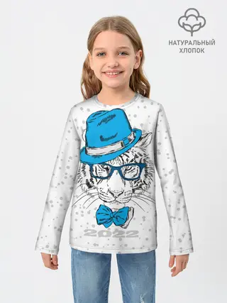 Детский лонгслив / Белый тигр в синей шляпе