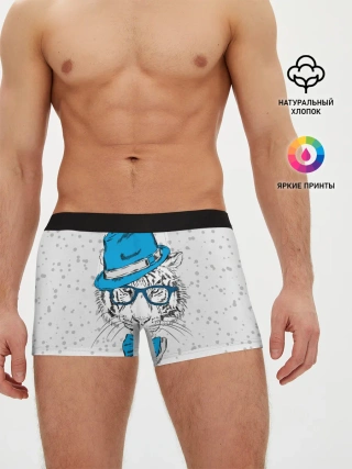 Мужские трусы боксеры / Белый тигр в синей шляпе