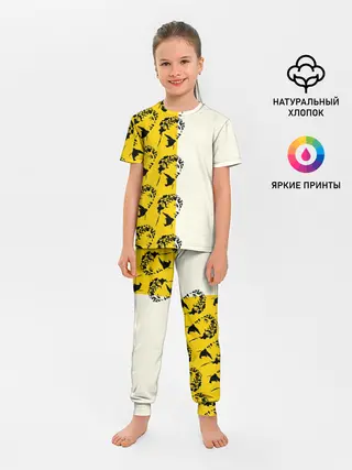 Пижама офигенная, ткань эластичная, не растягивается, рисунок яркий, после стирок яркость не теряется, к телу тоже очень приятная. Думаю сноса ей не будет