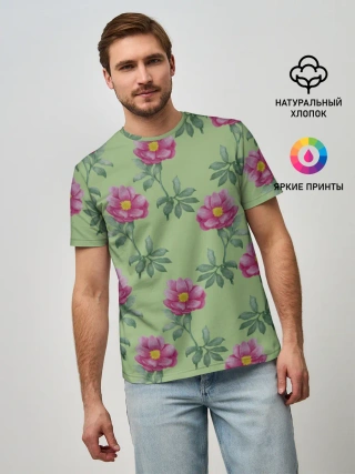 Детская базовая футболка / Пионы на светло зеленом фоне