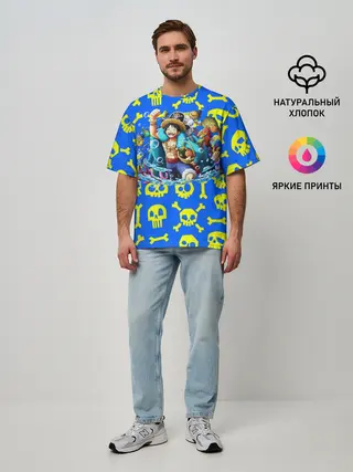Детская базовая футболка / Веселый Монки. Синий фон череп и кости