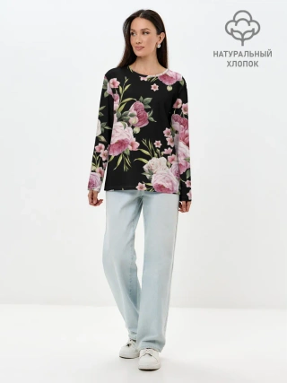 Лонгслив женский. Хлопок / Пионы на Чёрном