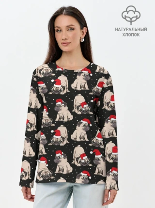 Лонгслив женский. Хлопок / Новогодние мопсы