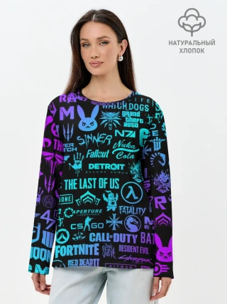 Лонгслив женский. Хлопок / ЛОГОТИПЫ ИГР НЕОН / NEON GAMES LOGO