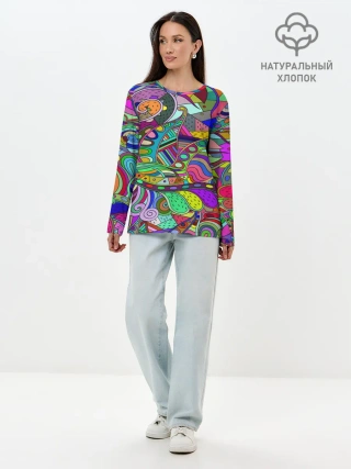 Лонгслив женский. Хлопок / Дудлы узор разноцветный хиппи