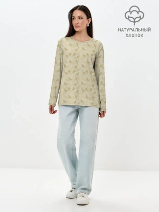 Лонгслив женский. Хлопок / Бежевый принт силуэты птичек