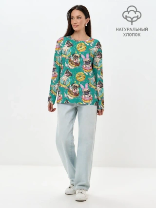 Лонгслив женский. Хлопок / Мопсы в пончиках
