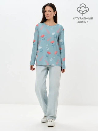 Лонгслив женский. Хлопок / Цветочки и листики на голубом