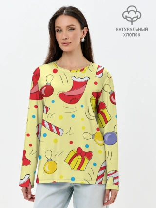 Лонгслив женский. Хлопок / Новогодний узор на желтом фоне