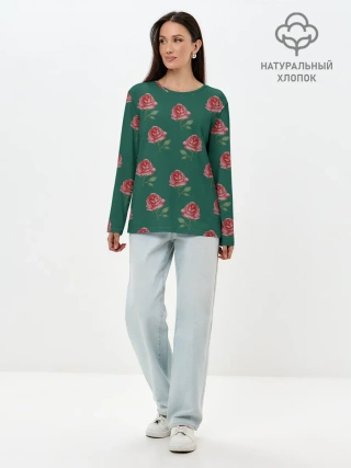 Лонгслив женский. Хлопок / Розы на зеленом фоне