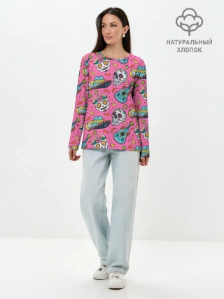 Лонгслив женский. Хлопок / День Мёртвых узор из черепов