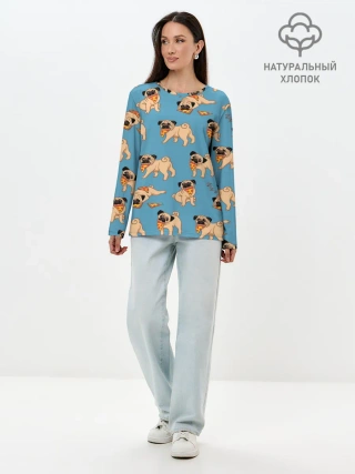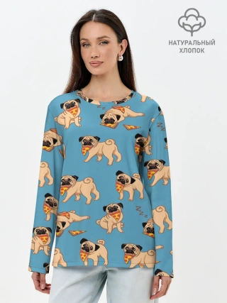 Лонгслив женский. Хлопок / Мопсы с пиццей