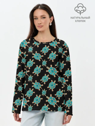 Лонгслив женский. Хлопок / Бирюзовые черепашки брошка
