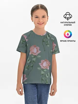 Детская базовая футболка / Красные розы на зеленом фоне