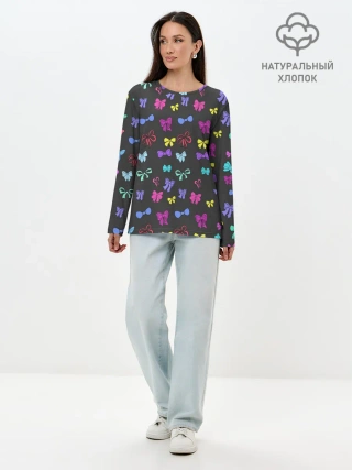 Лонгслив женский. Хлопок / банты радужные на темно-сером