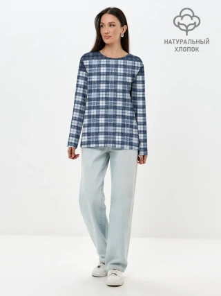 Лонгслив женский. Хлопок / Синий узор в клетку