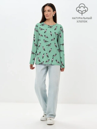 Лонгслив женский. Хлопок / Голуби на зеленом