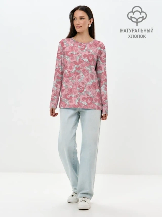 Лонгслив женский. Хлопок / Нежно коралловые розы