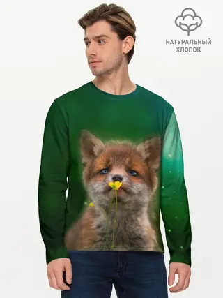 Мужской лонгслив базовый / Лисенок нюхает цветок