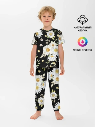Детская пижама с брюками / Ромашки на черном фоне