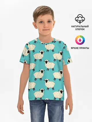 Детская базовая футболка / Овечки паттерн на бирюзовом