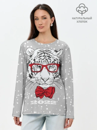 Лонгслив женский. Хлопок / Белый тигр с красным бантом