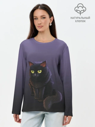 Лонгслив женский. Хлопок / черный кот на фиолетовом