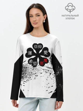 Лонгслив женский. Хлопок / Чёрный клевер с иероглифами