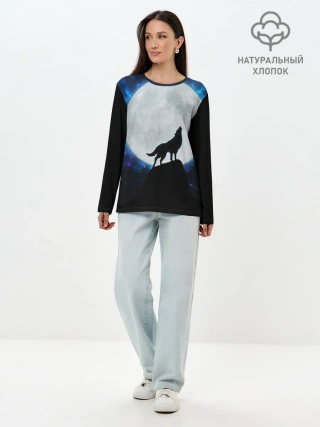 Лонгслив женский. Хлопок / Волк воющий на луну