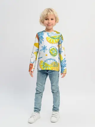 Взяли на размер побольше. На рост 129 платье 140. Цвета конечно не такие яркие как на фото, но все же смотриться хорошо