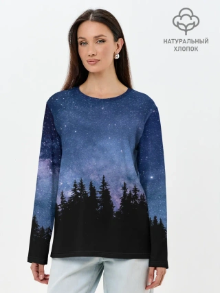 Лонгслив женский. Хлопок / НОЧНОЙ ЛЕС И ЗВЕЗДЫ