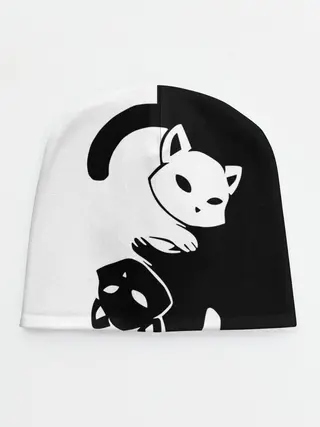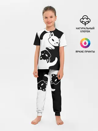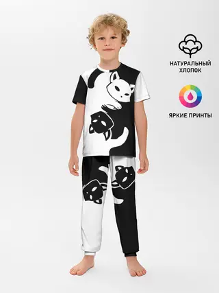 Детская пижама с брюками / Черный и белый кот кувыркаются.