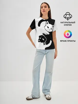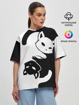Женская футболка оверсайз / Черный и белый кот кувыркаются.