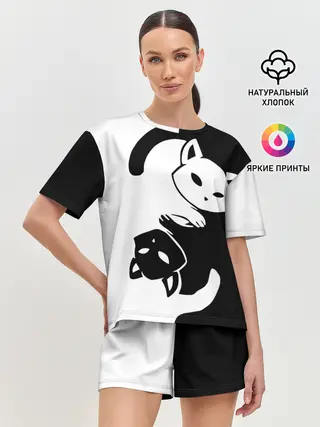 Женская пижама с шортами / Черный и белый кот кувыркаются.