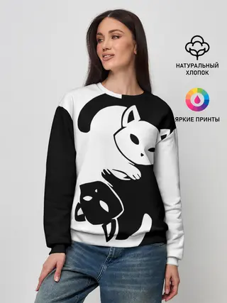 Лонгслив женский. Хлопок / Черный и белый кот кувыркаются.