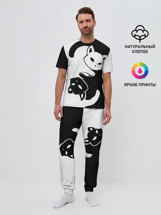 Мужская пижама с брюками / Черный и белый кот кувыркаются.