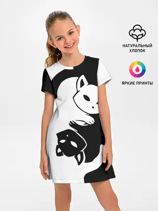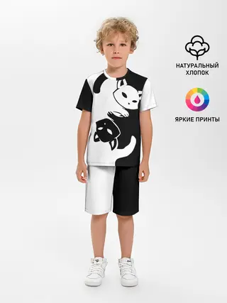 Детская пижама с шортами / Черный и белый кот кувыркаются.