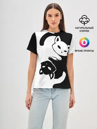 Женская базовая футболка / Черный и белый кот кувыркаются.