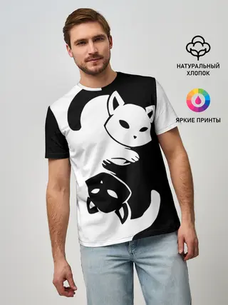 Мужская футболка оверсайз / Черный и белый кот кувыркаются.