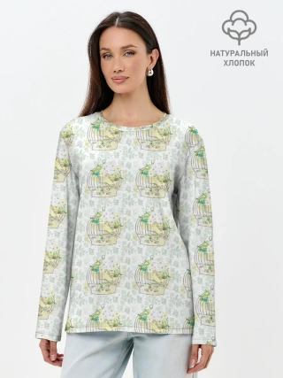 Лонгслив женский. Хлопок / Канарейки в клетках