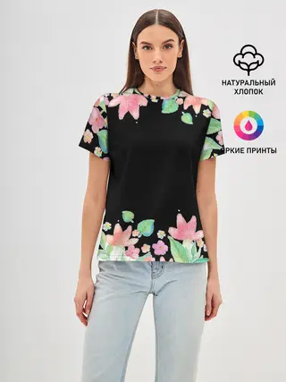 Женская базовая футболка / Рамка из розовых и зеленых листьев