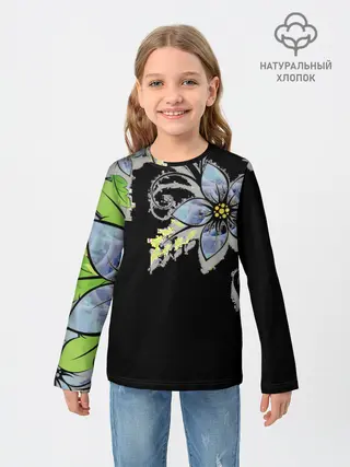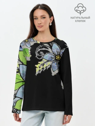 Лонгслив женский. Хлопок / Цветочная композиция с бабочками