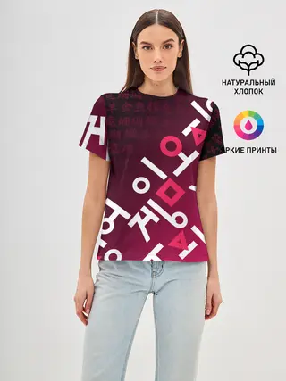 Женская базовая футболка / ИГРА В КАЛЬМАРА, ИЕРОГЛИФЫ ЛОГО