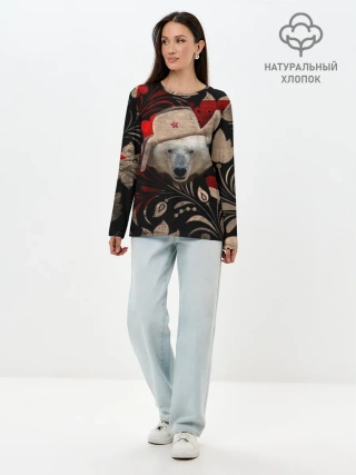 Лонгслив женский. Хлопок / Медведь в ушанке
