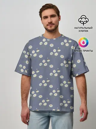 Мужская футболка оверсайз / Ромашки на сером паттерн