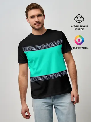 Мужская футболка оверсайз / Черно-бирюзовый узор