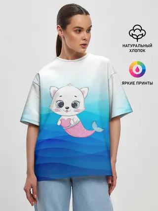 Женская футболка оверсайз / Котик русалочка | Русалка с сердечком
