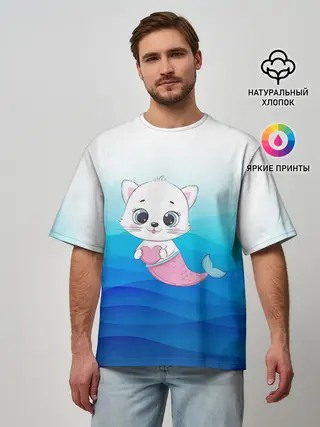 Мужская футболка оверсайз / Котик русалочка | Русалка с сердечком