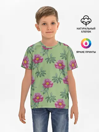 Детская базовая футболка / Пионы на светло зеленом фоне
