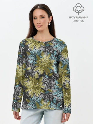 Лонгслив женский. Хлопок / Черно оливковый цветочный